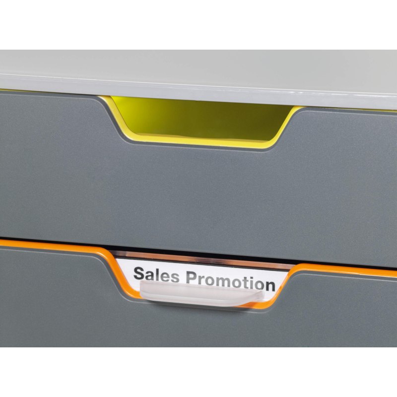 Med transparente indstikslommer og udskiftelige etiketter kan hver skuffe tilpasses individuelt, og Durable giver 5 års garanti samt gratis reservedelsservice på indstik i garantiperioden. Et pålideligt og fleksibelt valg blandt moderne skuffekabinetter.