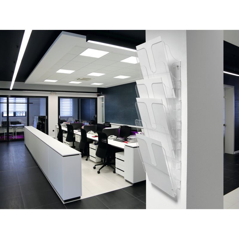 Hvert rum har en kapacitet på 23 mm, og holderen kan udvides til en bæreevne på op til ca. 6 kg, hvilket sikrer stabil opbevaring af større mængder tryksager. Den lodrette, pladsbesparende konstruktion gør denne brochureholder til væg ideel til receptioner, venteværelser, udstillingslokaler og messestande, hvor synlighed og nem adgang er afgørende.