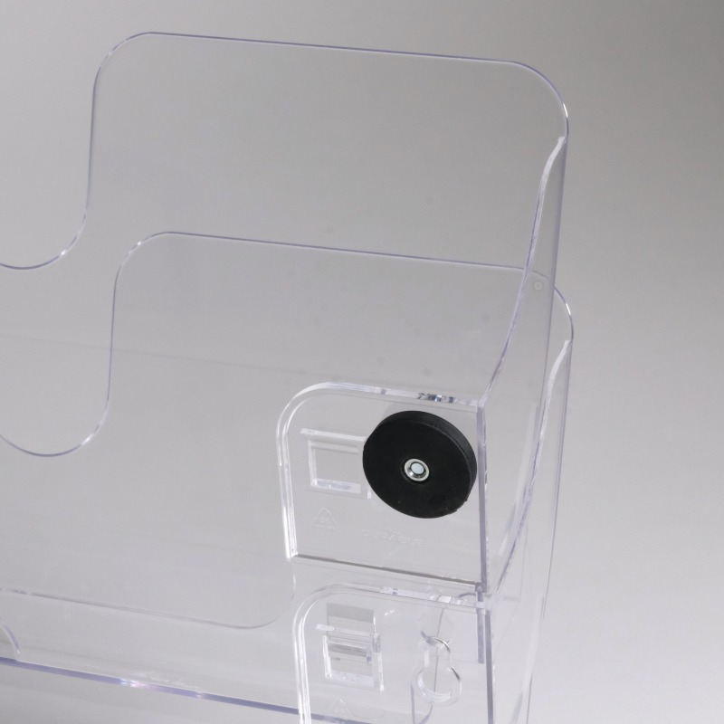 Brochureholderen med 2 rum er fremstillet i slidstærk plast og har en fyldedybde på 23 mm, hvilket giver plads til en god mængde dokumenter, foldere eller informationsark. Den magnetiske funktion gør det muligt at flytte og omplacere holderen uden brug af værktøj, hvilket giver maksimal fleksibilitet i både erhverv, offentlige institutioner, lager.