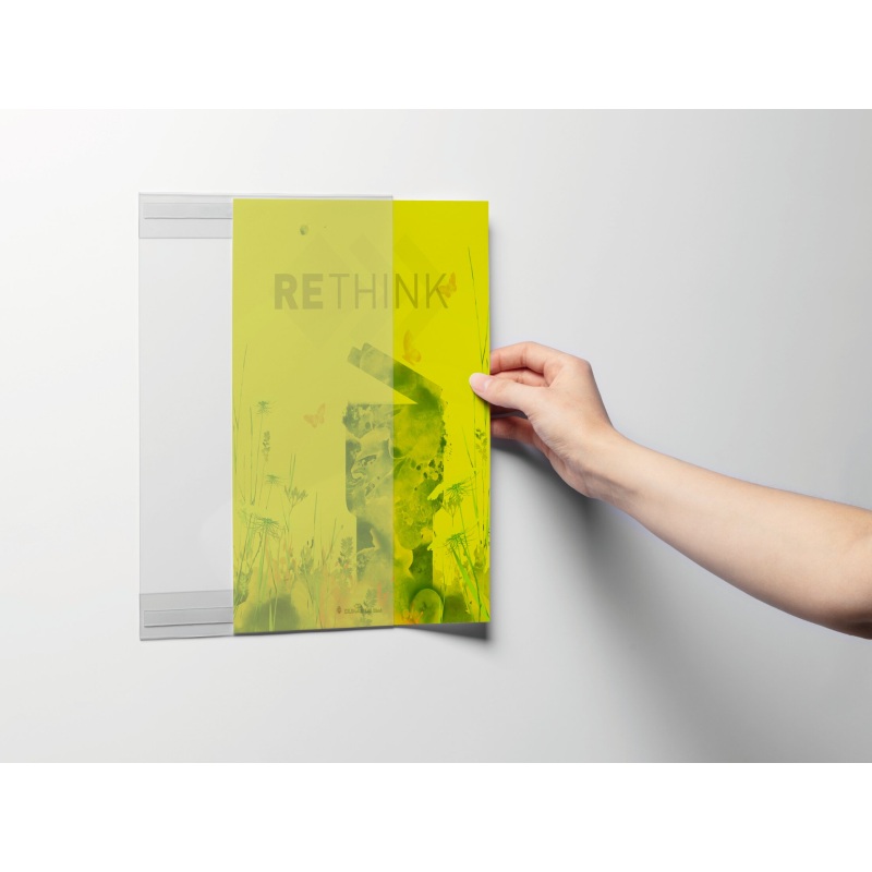 De smarte selvklæbende inforammer fastgøres nemt på både glatte og let ujævne overflader, så længe de er rene og stabile. Bagsiden er udstyret med to stærke klæbestrimler, der sikrer en permanent montering. Når rammen skal bortskaffes, kan klæbestrimlerne fjernes uden at efterlade rester, så materialerne kan sorteres korrekt og genanvendes.