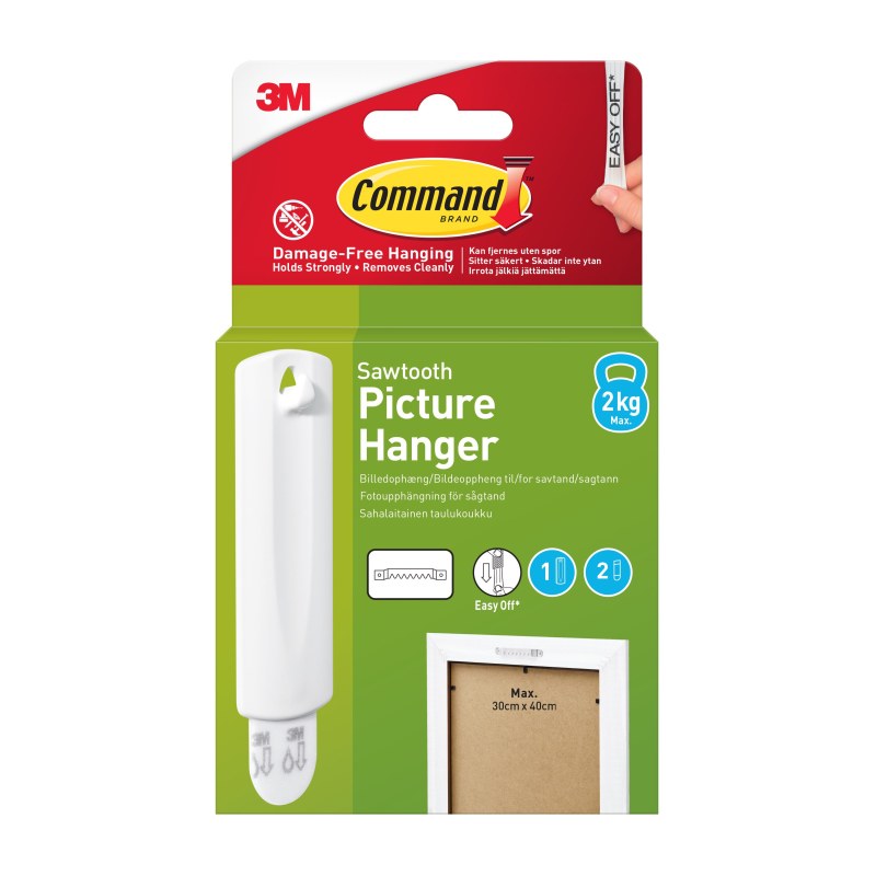 3M Command Billedophæng med takker er en stærk og praktisk løsning til billedophæng, billeder, dekorationer og lette genstande, uden at du behøver søm, værktøj eller skruer. Dette robuste billedophæng bruger 3M’s velkendte plakatstrips-teknologi, som gør det muligt at hænge op uden at beskadige vægge, og uden at efterlade klæberester ved fjernelse. Den store hvide krog leveres med 2 stærke Posterstrips, der giver en bæreevne på op til 2 kg, ideel til mellem størrelse rammer, rammer eller skilte.