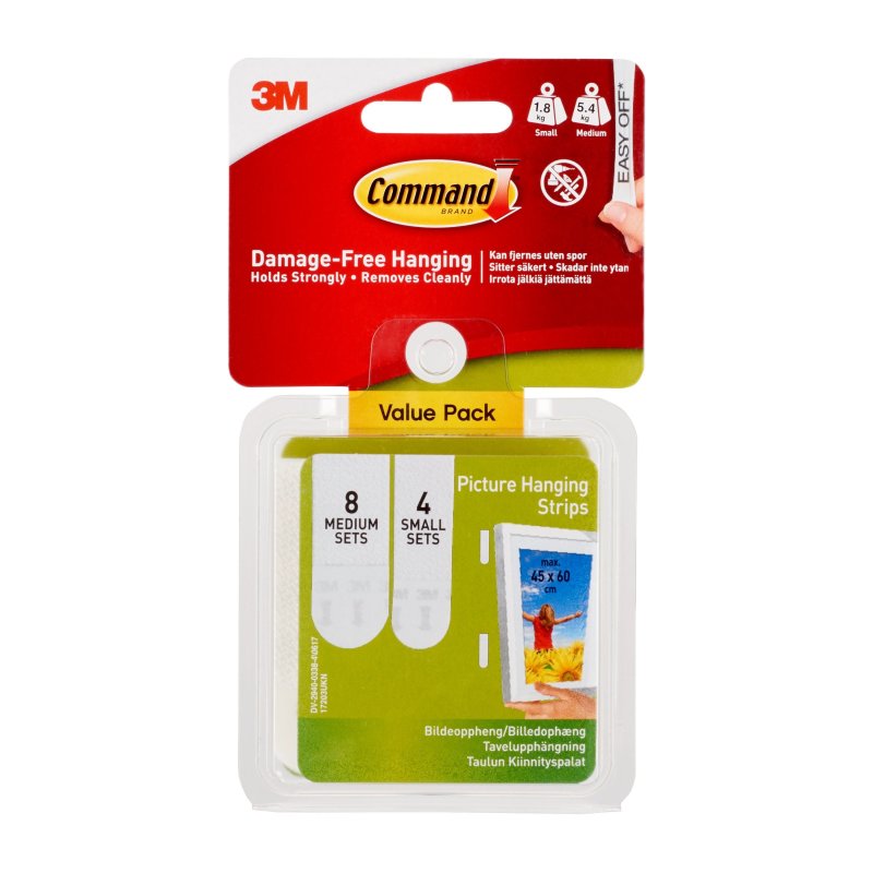 Denne pakke indeholder både små og mellem strips – 4 sæt små strips med en bæreevne på 1 kg parvis og 8 sæt mellem strips med en bæreevne på 2,5 kg parvis – hvilket giver fleksibel ophængning af både lette og lidt tungere plakater og billeder. Ophængning i hjemmet, børneværelser, studenterboliger eller kontorer bliver derfor både nem og sikker.