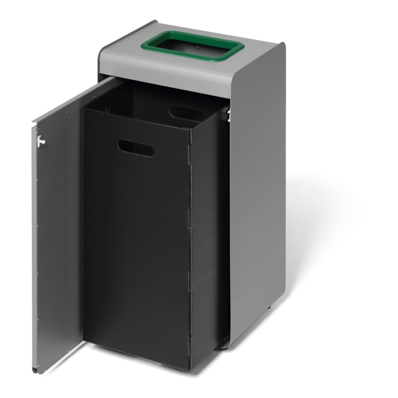 Denne sorteringsskraldespand er fremstillet i robust, pulverlakeret metal med en aftagelig indvendig plastbeholder, som gør tømning og rengøring hurtig og hygiejnisk. Den har en grøn indkaståbning og tydeligt piktogram på forsiden, så du nemt kan adskille affaldstyper som papir, plast, glas eller restaffald.