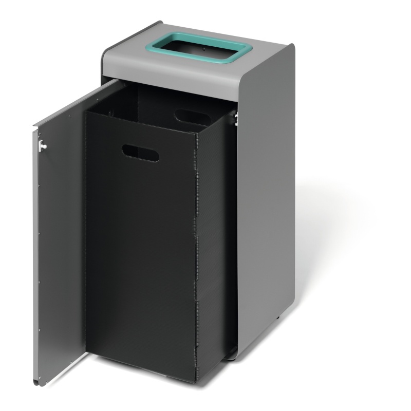 Denne sorteringsskraldespand er fremstillet i robust, pulverlakeret metal med en aftagelig indvendig plastbeholder, som gør tømning og rengøring hurtig og hygiejnisk. Den har en lys grøn indkaståbning og tydeligt piktogram på forsiden, så du nemt kan adskille affaldstyper som papir, plast, glas eller restaffald.