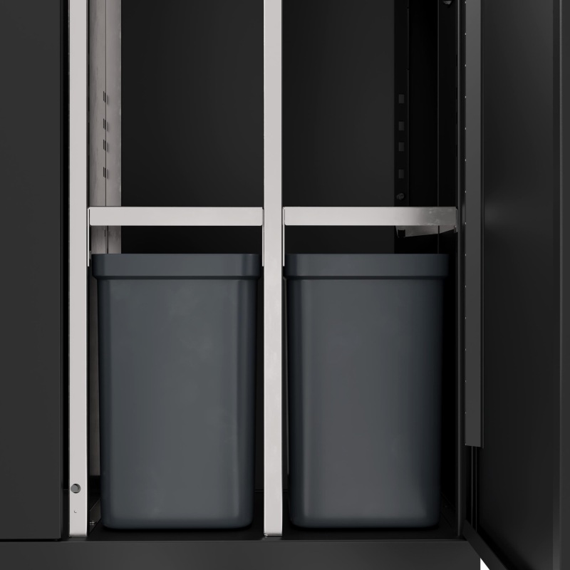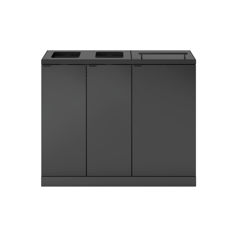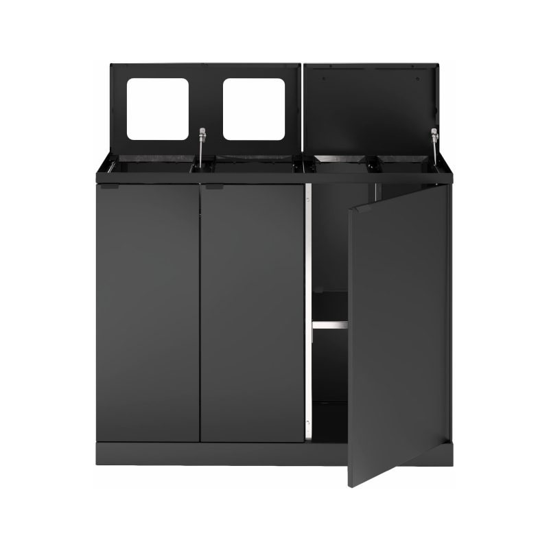 Denne model er udstyret med åbne indkast og løftelåg med gasdæmpere, hvilket sikrer enkel og ergonomisk betjening. Toplåget kan løftes let uden belastning, og de frontmonterede døre med soft close gør tømning af beholderne både nem og komfortabel. Integrerede poseholdere holder affaldsposerne sikkert på plads, mens det stilrene design skjuler poserne og skaber et ryddeligt udtryk.