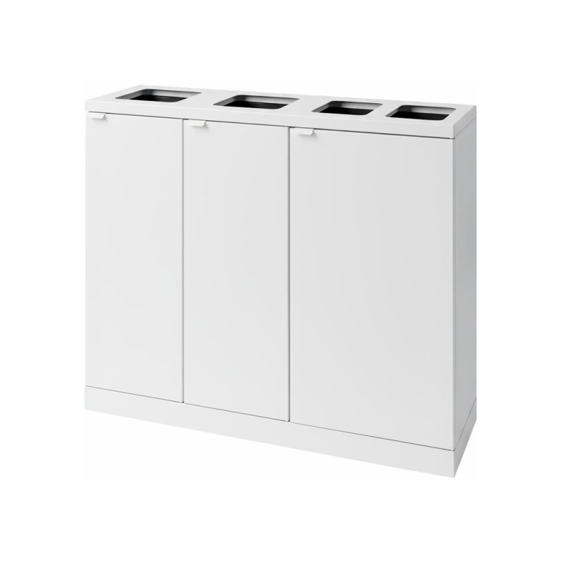 Systemet er også nemt at flytte rundt takket være de skjulte hjul bag soklen, hvilket gør det oplagt i fleksible kontormiljøer eller fællesområder, hvor behovene kan ændre sig løbende. Sammen med de skjulte hængsler og rene linjer fremstår det som en moderne og diskret løsning til affaldssortering indendørs.