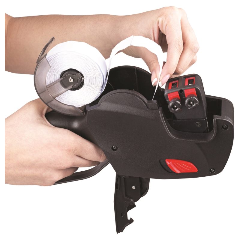 Komplet startsæt med en prispistol, en rulle hvide permanente prisetiketter 26x16 mm og en sort blækpatron