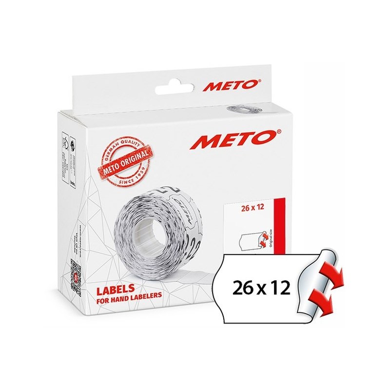 Etiketterne kan også anvendes i METO ProLine, Arrow, Flash med etiketstørrelse 26 x 12 mm. Etiketternes høje kvalitet gør, at de problemfrit kan dispenseres i prismærkepistolen i høj hastighed.