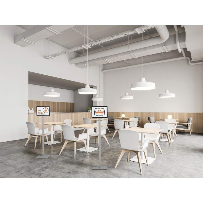 Den dobbeltsidede stander kan læses fra begge sider og egner sig både som gulvskilt og informationsholder. Takket være de medfølgende magnetiske Duraframe-rammer er det let at udskifte indhold, så du altid kan præsentere opdateret information. Standeren giver fleksibilitet med en smart mekanisme, der gør det muligt at skifte mellem stående og liggende format uden brug af værktøj.
