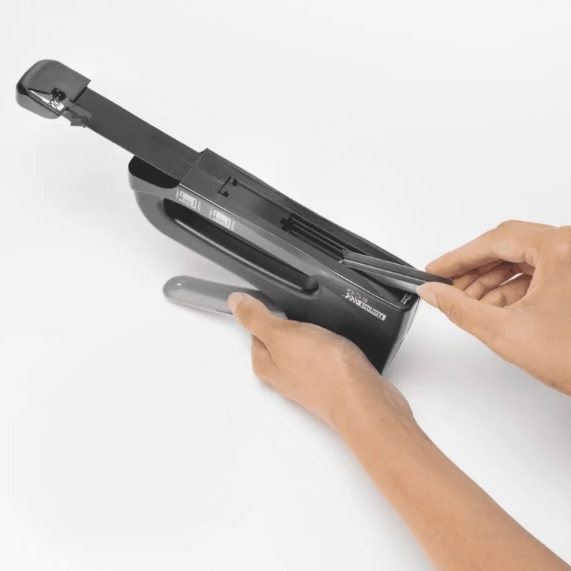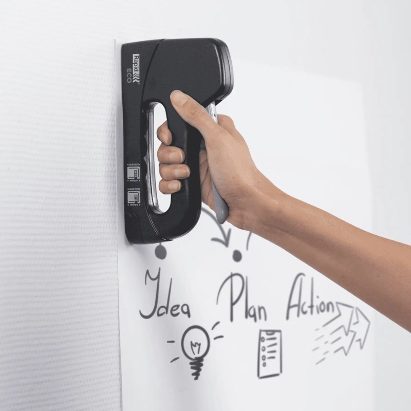 Kabinettet er fremstillet i slagfast plast og består af 100 % recirkuleret plast, hvilket gør den til et ansvarligt valg blandt moderne hæftepistoler.