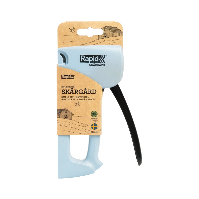 Denne lyseblå hæftepistol er fremstillet i Sverige og produceret af mindst 90 % genanvendt materiale. Kabinettet i slagfast plast kombineret med indvendige sliddele i hærdet stål sikrer lang holdbarhed.