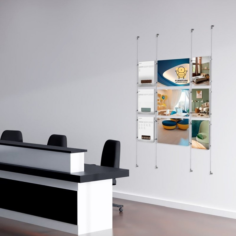 Det robuste wire-system i stål giver et moderne udtryk og holder displayet stramt og professionelt. Alle lommer er fremstillet i 2 mm ridsefast akryl, der fremstår let og eksklusivt i vinduet.