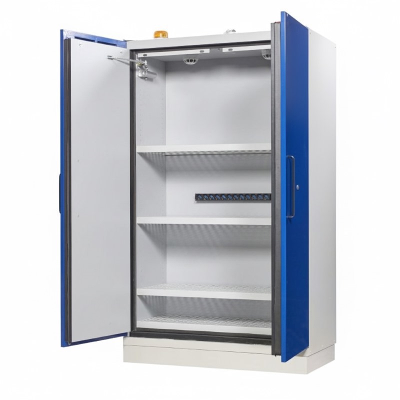 Sikkerhedsskabet har Automatisk hydraulisk dørlukker med temperaturudløst selvluk ved 47 °C, hold-åben funktion og centralt placeret nøglelås (med serienummer). Det beskytter opbevarede lithium-ion-batterier mod overophedning på grund af eksterne brande i mindst 90 minutterlithium-ion-batterier mod overophedning på grund af eksterne brande i mindst 90 minutter