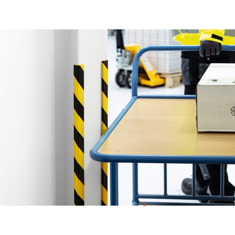 Den markante gul/sorte advarselsfarve i henhold til RAL-standard giver høj synlighed og hjælper med at forebygge ulykker. Dermed fungerer denne selvklæbende kantbeskytter både som beskyttelse og advarsel i ét produkt.