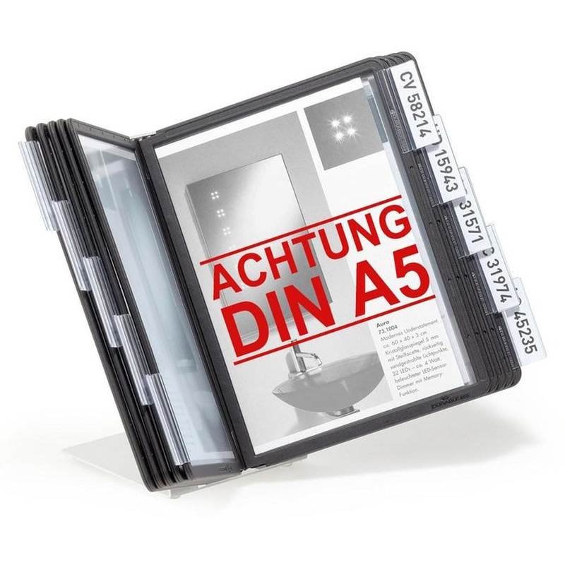 Et registersystem er den ideelle løsning til kontor, reception eller lager, hvor vigtige informationer skal være synlige, let tilgængelige og præsenteret på en professionel måde. Denne registersystem bordmodel leveres komplet med 10 Sherpa-registerlommer i A5-format, perfekt til organisering af prislister, vejledninger, sikkerhedsinstruktioner eller interne procedurer.