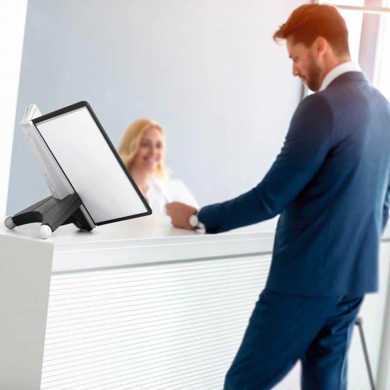Det robuste bordregistersystem er monteret på en ekstra stabil og skridsikker bordstander i sort og grå, hvilket giver høj stabilitet selv ved intensiv daglig brug. Takket være den smarte tapmekanisme kan paneler nemt udskiftes eller suppleres, så systemet kan tilpasses virksomhedens behov.