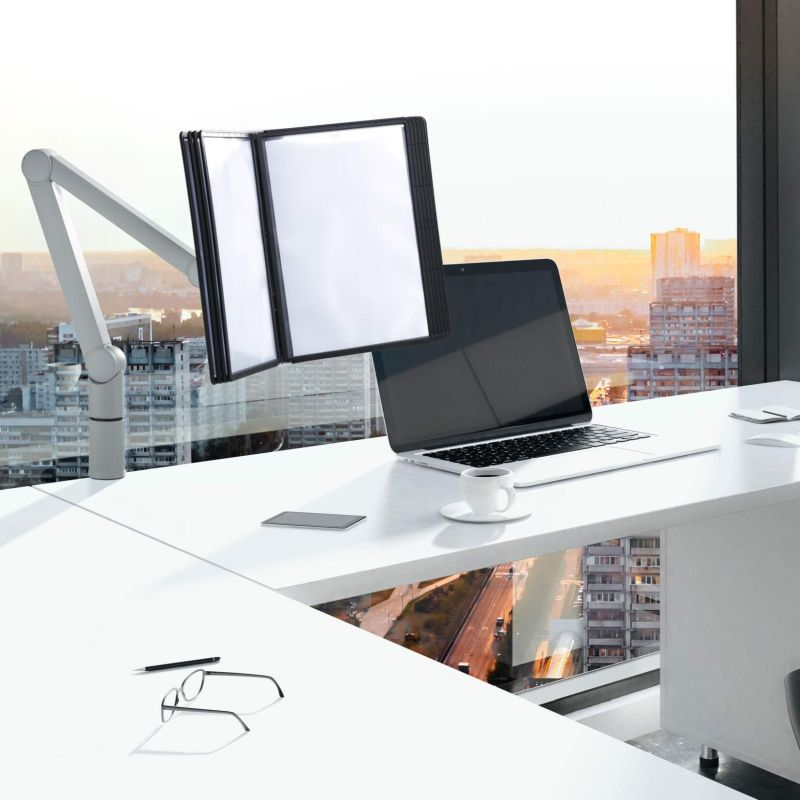 Durable Sherpa svingarm er et professionelt og fleksibelt registersystem til bord, der gør det nemt at organisere og præsentere informationer på en pladsbesparende måde. Denne registersystem bordmodel leveres som en stabil svingarm i aluminium med tre led og justerbar holdekraft, der giver høj fleksibilitet i daglig brug. Armen kan drejes 360° og justeres i højden, hvilket gør den ideel til dynamiske arbejdspladser, hvor dokumenter skal være lettilgængelige.