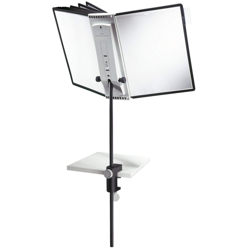 Durable Sherpa Desk Clamp er et professionelt og fleksibelt registersystem til bord, udviklet til at præsentere og organisere informationer på en effektiv og pladsbesparende måde. Denne registersystem bordmodel leveres komplet med 10 A4 registerlommer i slidstærkt polypropylen med farvede profilrammer og refleksionssvag folie, der sikrer høj læsbarhed og gør dem velegnede til scannere. De medfølgende faner med blanke indstik giver tydelig struktur og nem markering.