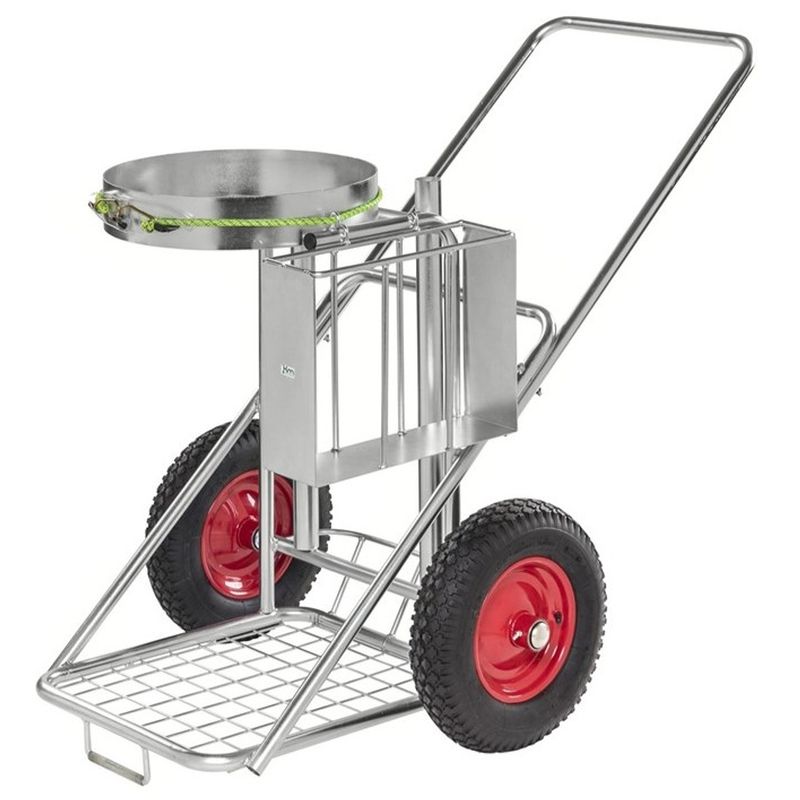 De to solide luftgummihjul med stålfælge gør vognen let at manøvrere på både asfalt, brosten og ujævne underlag. Det giver stabilitet og komfort i arbejdet, uanset om den anvendes som renovationsvogn eller pedellens rengøringsvogn.