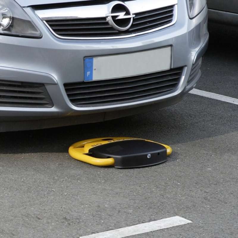 Med to fjernbetjeninger, nøgle til manuel oplåsning og batterioplader kan bøjlen nemt styres fra op til 15 meter. Den foldbare parkeringsbøjle med lås monteres på en trykstøbt metalbase og er ideel til afspærring af parkeringsplads.