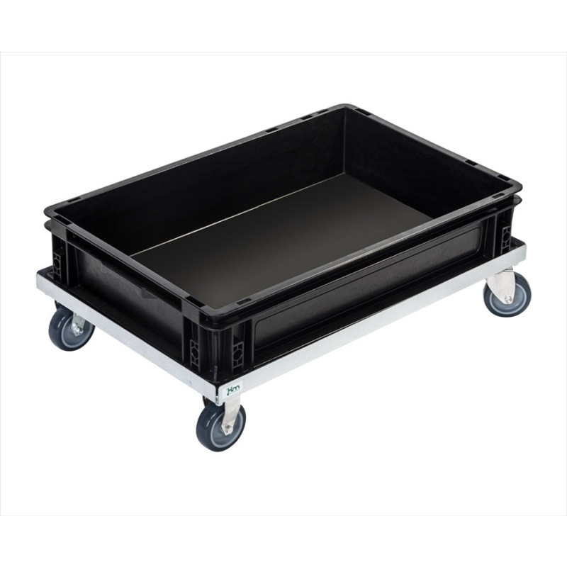 De præcise mål – 616 x 416 x 128 mm udvendigt og 600 x 400 mm indvendigt – gør vognen kompatibel med standard EURO-kasser. De fire hjul, alle drejbare Ø75 mm, sikrer nem styring, selv på smalle gangarealer. En praktisk kant rundt om platformen holder kasserne sikkert på plads under kørsel.