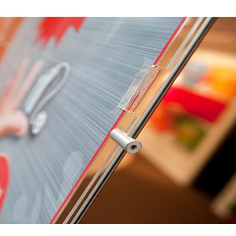Systemet består af to robuste stålstænger på 1,5 meter og en stor, glasklar akryl-lomme i format 70x100 cm, som giver maksimal synlighed af dine budskaber.