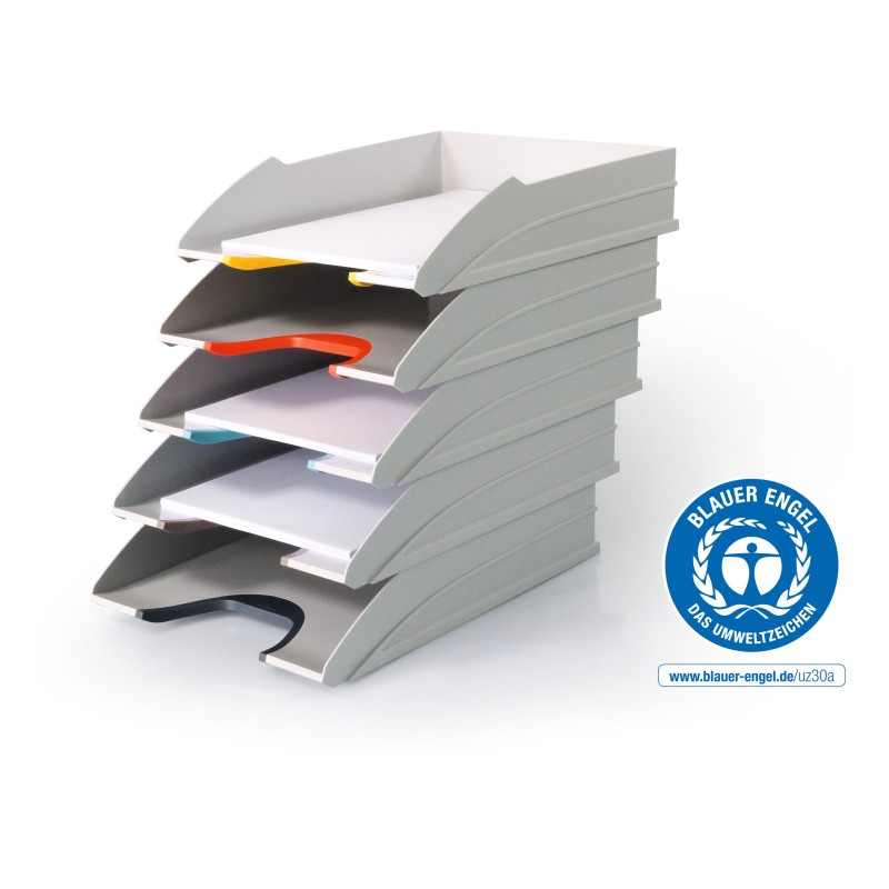 Disse brevbakker til skrivebord er fremstillet i robust plast med mere end 80% genanvendt materiale og er Blue Angel miljøcertificeret – et bæredygtigt valg til moderne kontorer. Den  lys grå base kombineret med farvede linjer i gul, orange, rød og lilla giver et stilrent design, der passer ind i alle arbejdsmiljøer.