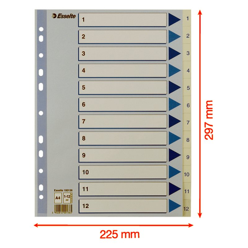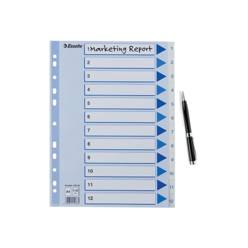 Esselte Register PP A4 1-12 hvid Kraftig hvid PP-folie - forstærket hulkanten - Pile-design.