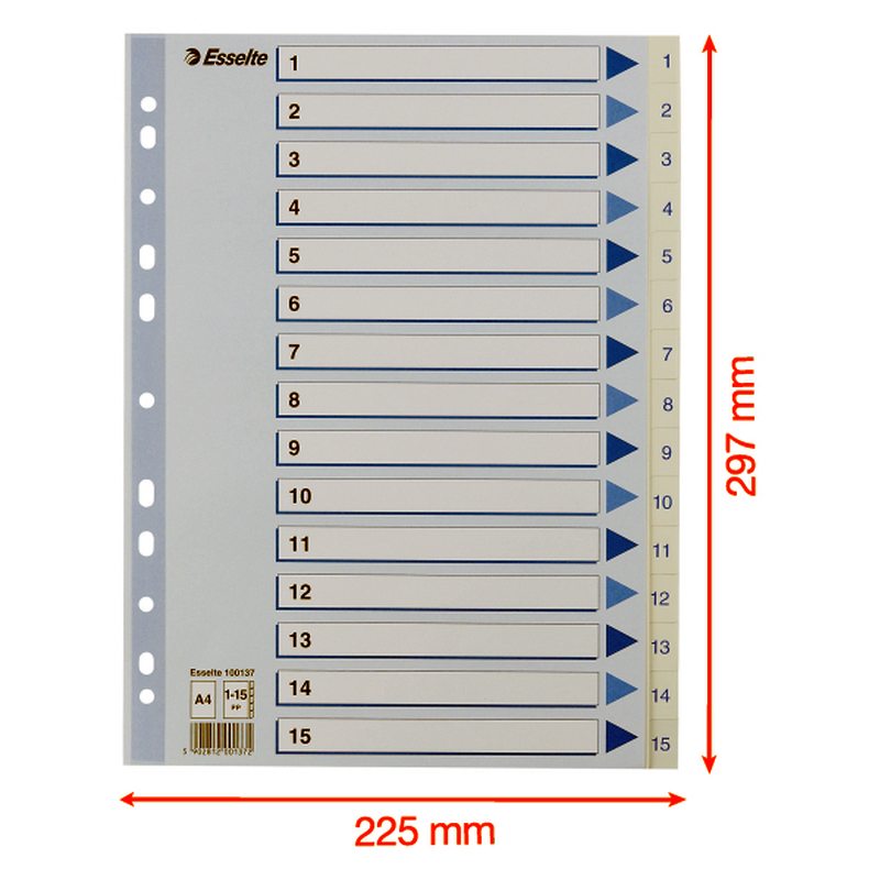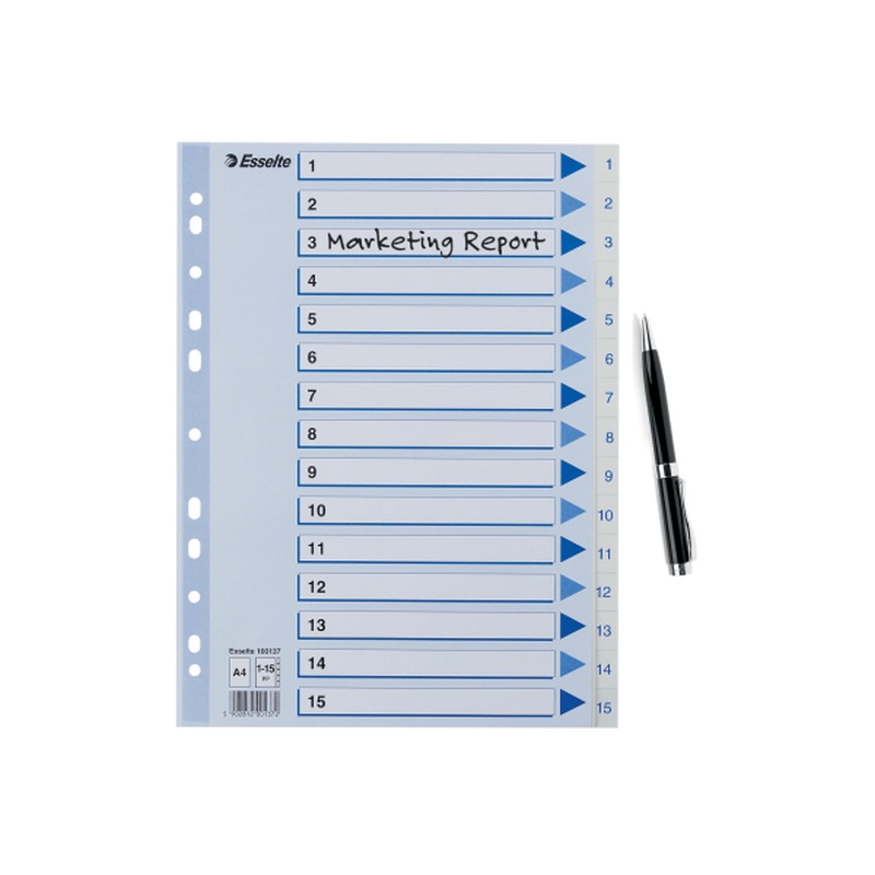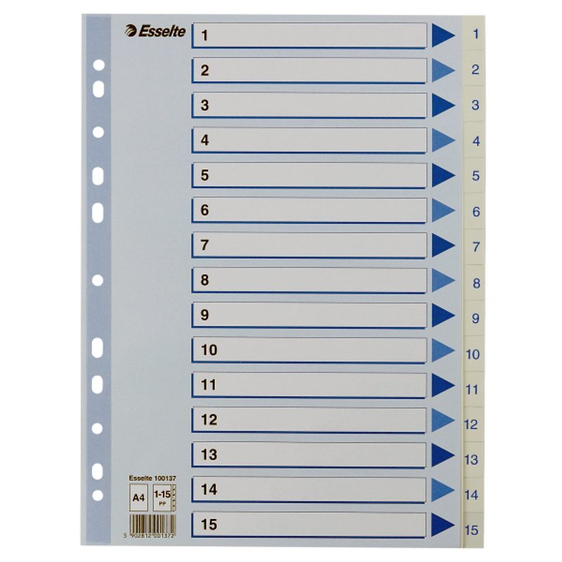 Esselte Register PP A4 1-15 hvid Kraftig hvid PP-folie - forstærket hulkanten - Pile-design.